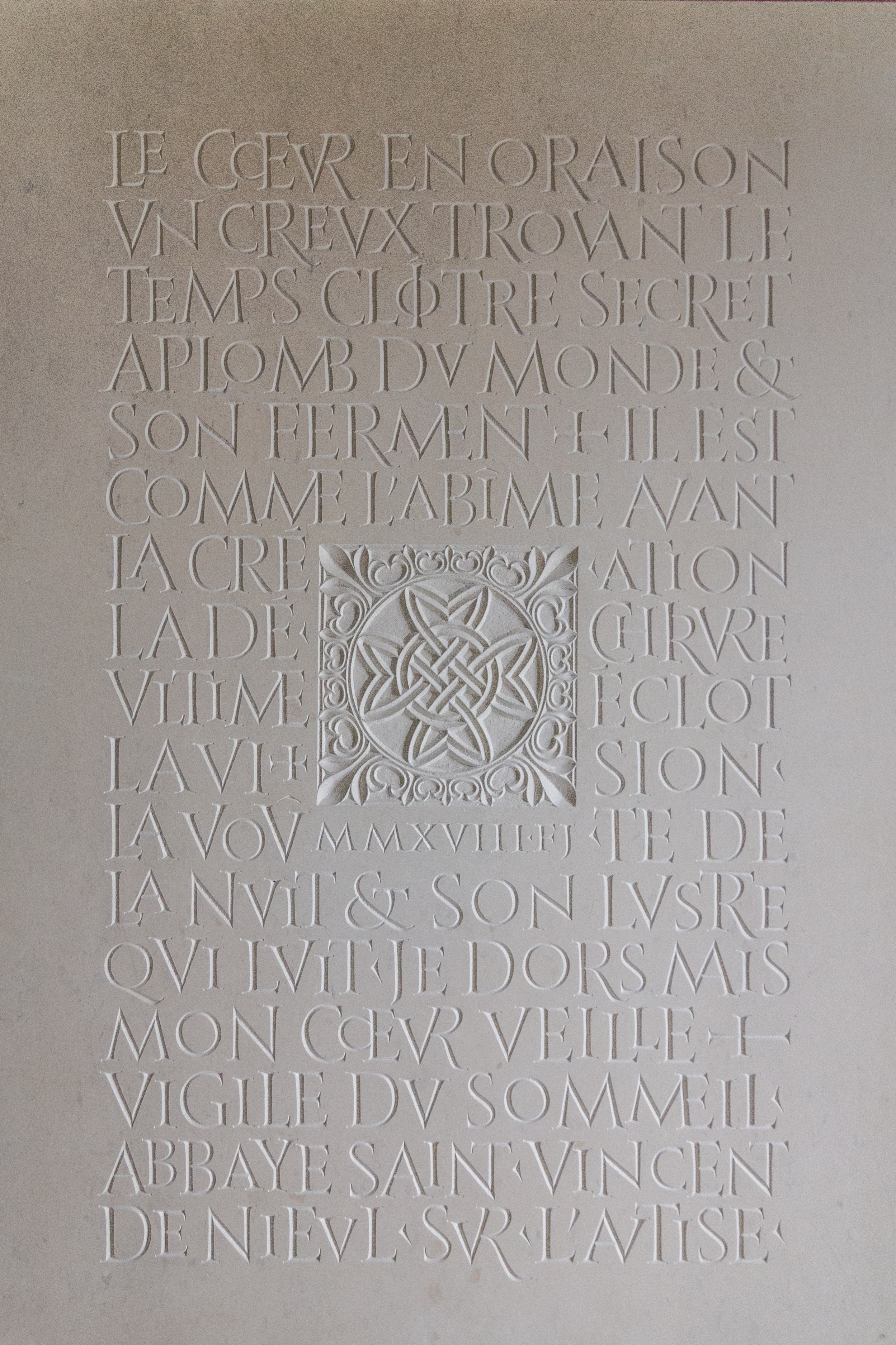 La gravure de cette pierre dédiée au cloître de Nieul-sur-l’Autise a été filmée par un vidéaste. La restitution proposée permet de découvrir la plaque gravée, de lire le texte sur son support et de suivre les gestes de Franck Jalleau au travail.